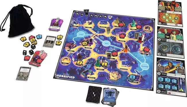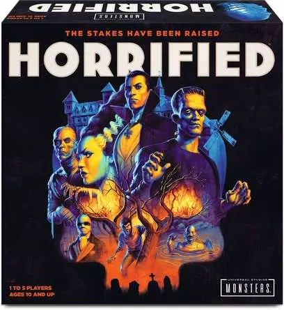 A cooperative game against the world's most famous monsters. The village is under attack! Dracula, The Mummy, Frankenstein’s Monster, his Bride, and more are on the rampage, and your team of heroes must defeat them. Each monster offers an entirely unique challenge, and players can adjust the difficulty by playing against a new group of adversaries every game! Overcome them all before the horror overwhelms you!